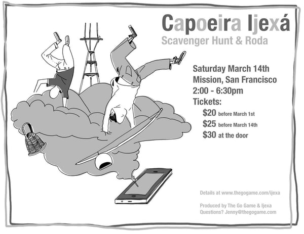 Join Mestre Urubu and the capoeiristas of Ijexa for a high-tech Capoeira-themed scavenger hunt and open roda on Saturday March 14th.