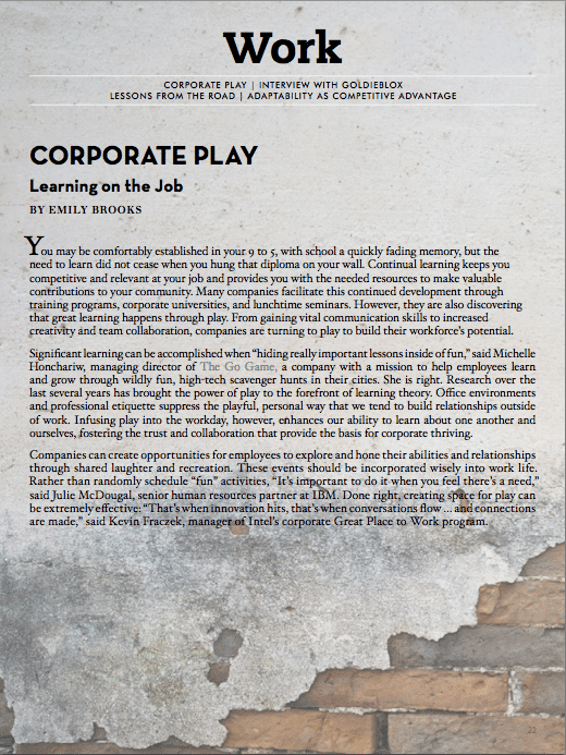 Significant learning can be accomplished when “hiding really important lessons inside of fun,” said Michelle Honchariw, managing director of The Go Game, a company with a mission to help employees learn and grow through wildly fun, high-tech scavenger hunts in their cities. She is right. Research over the last several years has brought the power of play to the forefront of learning theory. Office environments and professional etiquette suppress the playful, personal way that we tend to build relationships outside of work. Infusing play into the workday, however, enhances our ability to learn about one another and ourselves, fostering the trust and collaboration that provide the basis for corporate thriving.