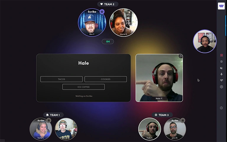 Let your coworkers shine in the virtual spotlight. Think of it like a mini talent show. Three to five players will come to the center of the screen at the same time. They'll be given a prompt such as “Tell us a corny joke” or “Do your best impression of a celebrity.” People will step outside of their comfort zone and show off some hidden talents you might not know about.