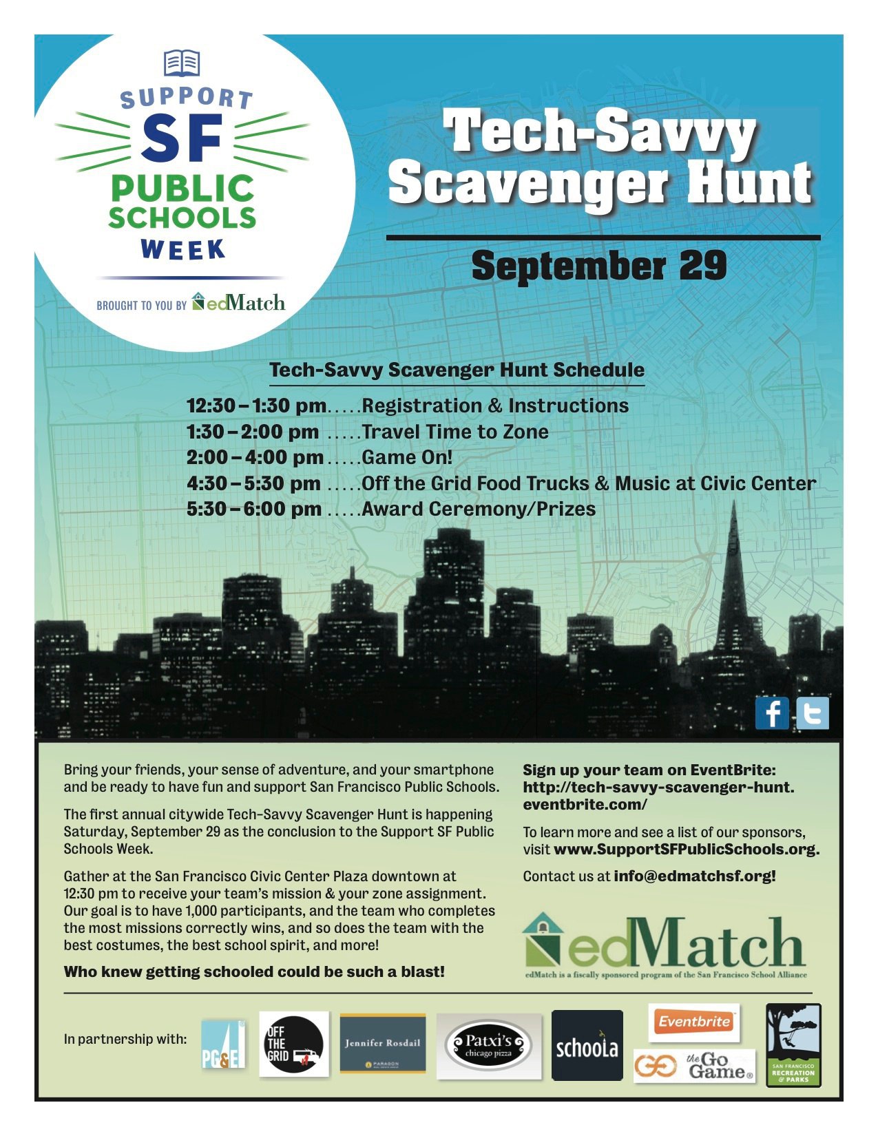 Did you know that San Francisco has an amazing public school system? It's true! But it doesn't always get the credit and TLC it deserves. So on September 29th, The Go Game is teaming up with EdMatch to create a city-wide scavenger hunt in support of SF Public Schools.