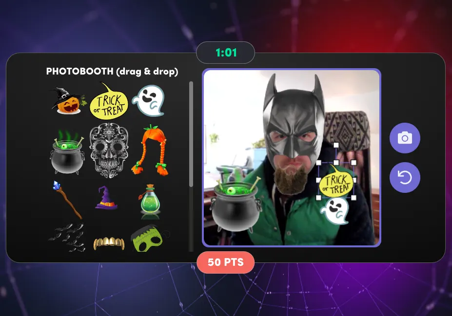 Compete against teammates on your knowledge of Halloween characters, magical items, candy, drawing skills, and more with our variety of mini-games. You’ll lip-sync, cackle, and have a witchin’ good time.