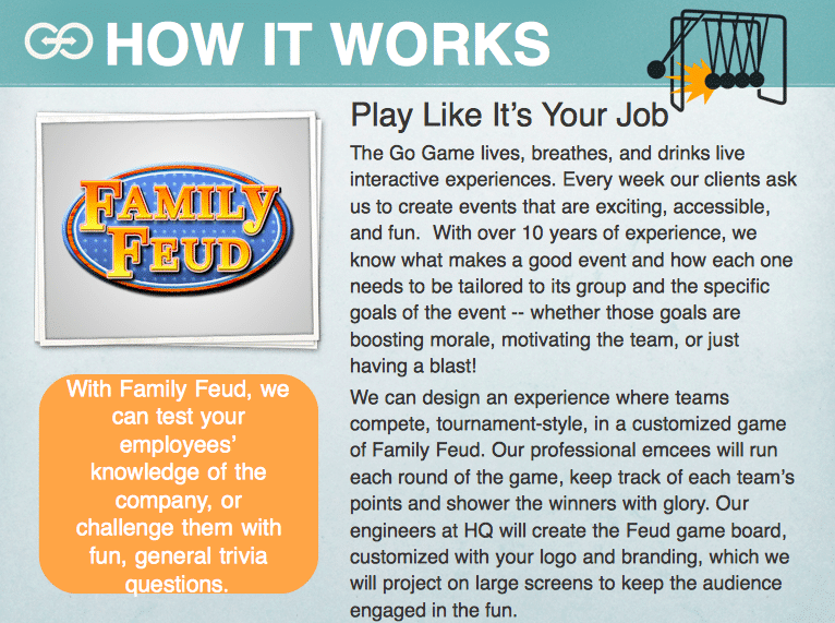 When you think of The Go Game, you might think "outdoor" "on-foot" "interactive" "freaking awesome" etc. But we've received SO MANY requests for gaming experiences that can be played with large groups in one room, that we huddled up and created something new.