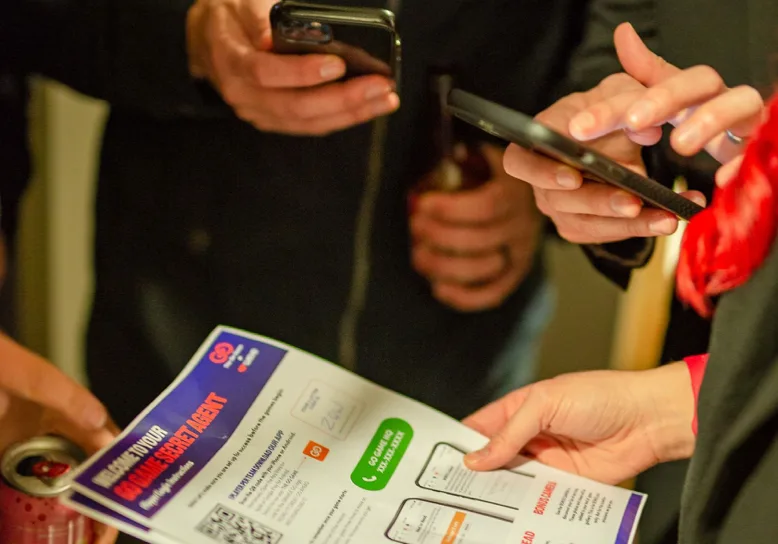 Get ready to Bond, James Bond, with your team, with our Secret Agent Adventure! Secret Agent is an in-person, immersive, live espionage puzzle game that’s playable anywhere, with a variety of host options for every budget. A spinoff of our Classic Adventure game, this experience takes your group through a spy-themed backstory and a variety of secret agent missions requiring teams to think critically and work together to break the code and master their skills! Through prompts on our app, teams take a crack at reading lips, forging signatures, finding hidden messages, and inventing disguises. By the end of the game, no cipher will be too challenging, no mission too menacing, and a winning team will take home all the glory.